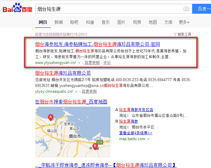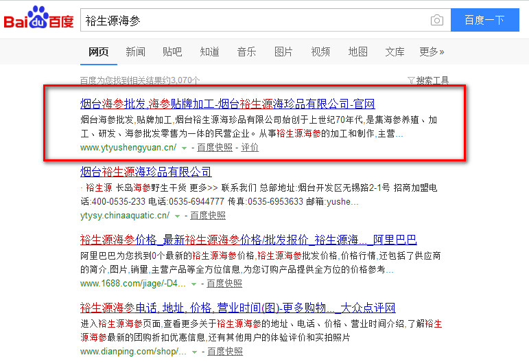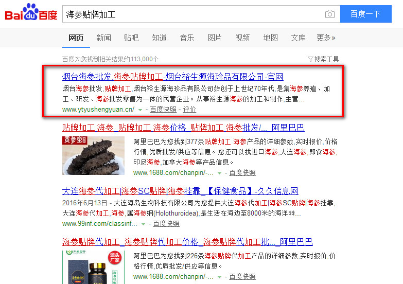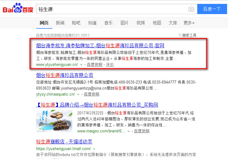 煙臺裕生源海珍品有限公司40年的精湛技術,專業從事鮮活海參、鹽漬海參、干海參、即食海參的生產、加工與銷售。公司在渤海灣擁有2000多畝的原生態純凈海域海參養殖基地,充足的海參貨源確保了裕生源海參的高品質,其參齡均在3-5年以上,參足密集飽滿,參刺堅挺有力,肉質肥厚,口感Q彈,營養豐富。下面是煙臺裕生源的關鍵詞排名案例: