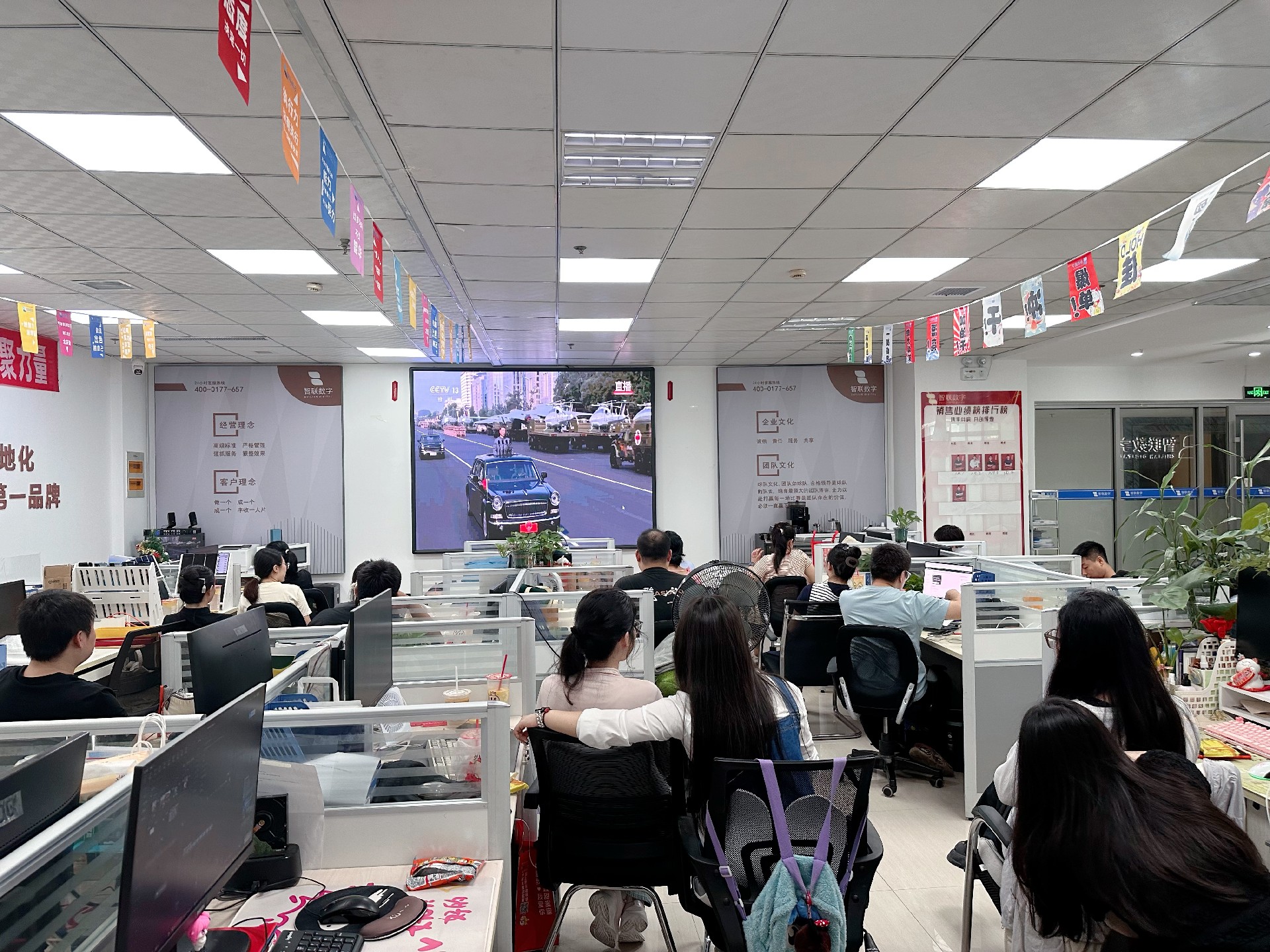 閱兵儀式開始,智聯數字全體員工準時觀看在線直播,大家目光追隨總書記習近平乘坐的紅旗牌檢閱車,經過金水橋,駛上長安街。仿佛大家也親臨現場,共同參與此次閱兵,大家神情專注地盯著大屏幕!跟隨現場的掌聲一起鼓掌,共同見證國家強大、民族復興的輝煌時刻!